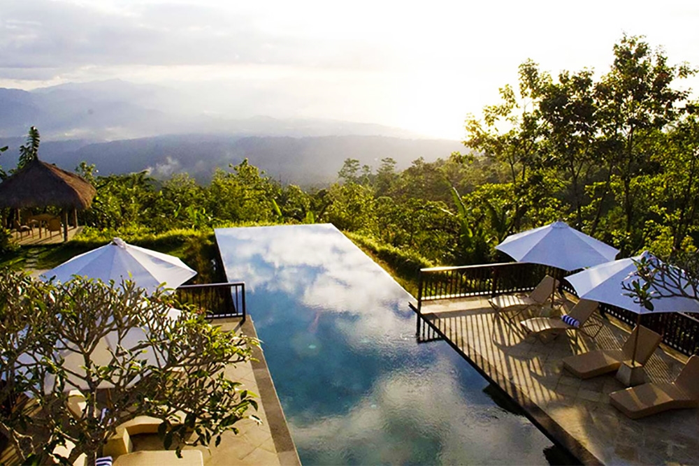The villas boast superb views of the rolling hills down to the sea, overlooking rice fields and jungle in the distance. In the evening the view is of the sun setting in the Java sea.