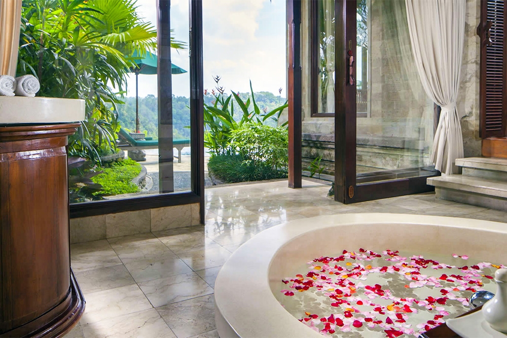 The Deluxe Pool Villa is encompassed within the secured confines of a private Balinese compound. It commands breathtaking views of the tropical greenery that lines the banks of the Ayung River in rural Ubud. A separate living environment is bathed in sunlight as is the bedroom that comes complete with its own spa-styled Balinese bathroom. A natural stone swimming pool and sun terrace lend themselves to pleasurable relaxation time amidst the raw beauty of the Ubud countryside.