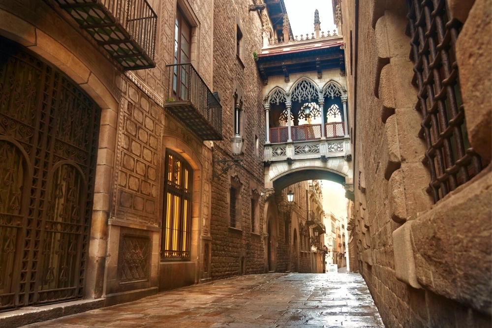[Gothic Quarter] The charming Gothic Quarter, or Barri Gòtic, has narrow medieval streets filled with trendy bars, clubs, and Catalan restaurants. The Museu d'Història de Barcelona shows the remains of the Roman city. Artisans sell leather and jewelry near the Cathedral of Barcelona, while flower stalls and street-food vendors line busy avenue La Rambla. The Plaça del Pi, named after the adjacent Gothic church, hosts a weekend art market.