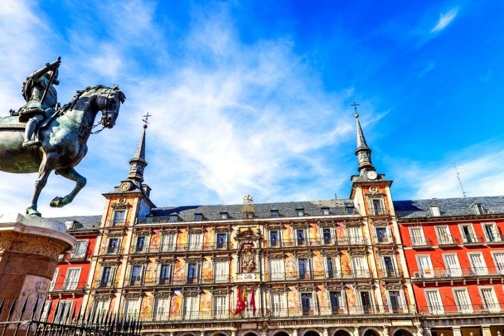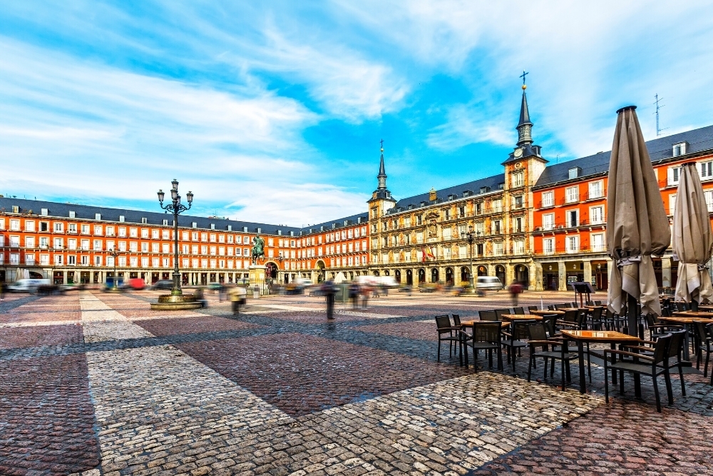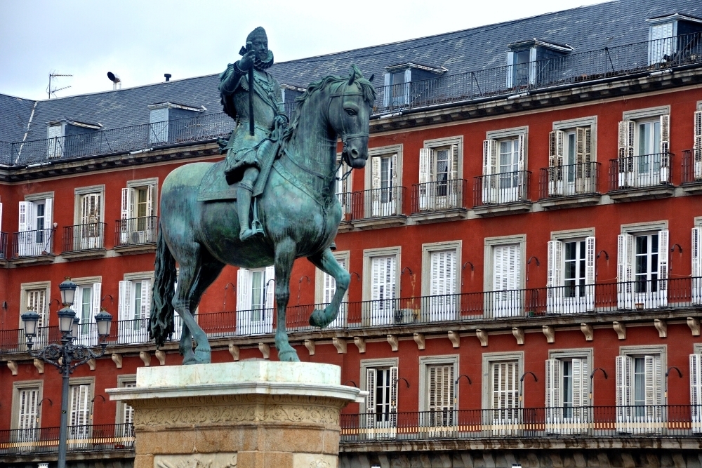 [Plaza Mayor] is a major public space in the heart of Madrid, the capital of Spain. It was once the center of Old Madrid. It was first built during the reign of Philip III. Only a few blocks away is another famous plaza, the Puerta del Sol.