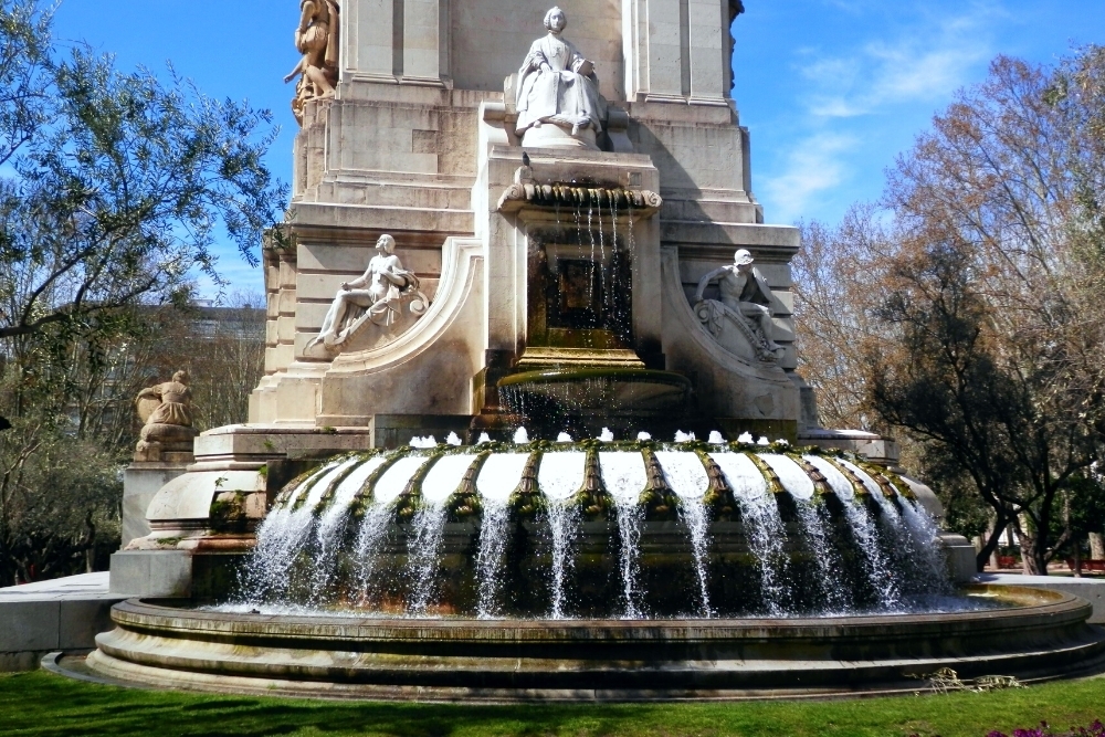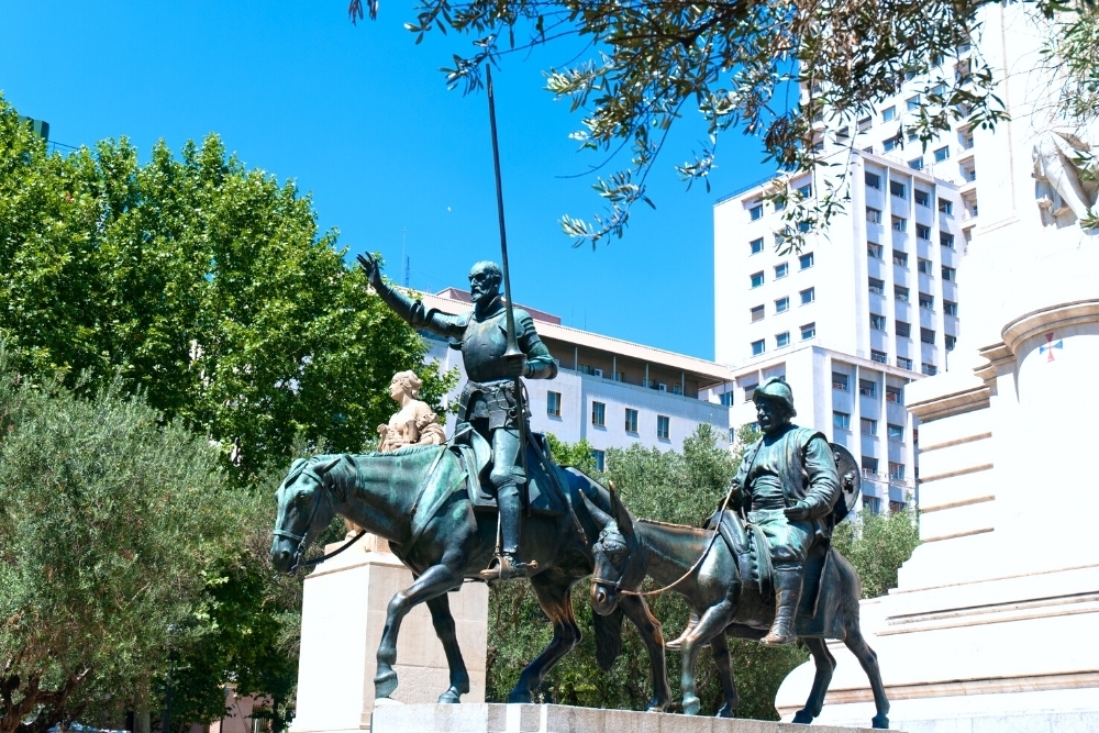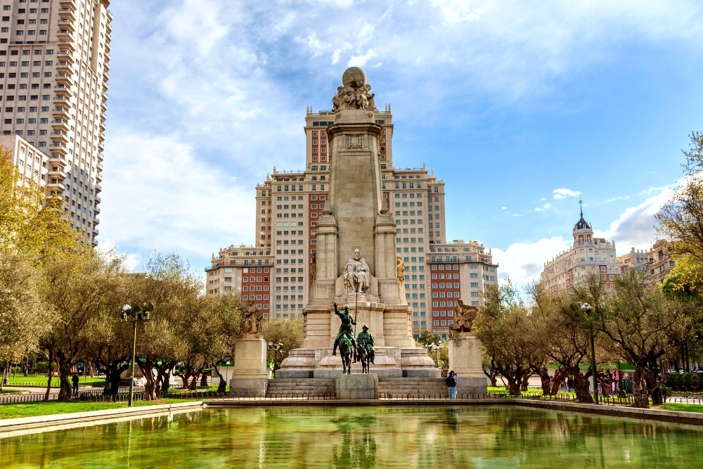 [Plaza de Espana] is a large square and popular tourist destination located in central Madrid, Spain at the western end of the Gran Vía. It features a monument to Miguel de Cervantes Saavedra and is adjacent to two of Madrid's most prominent skyscrapers.