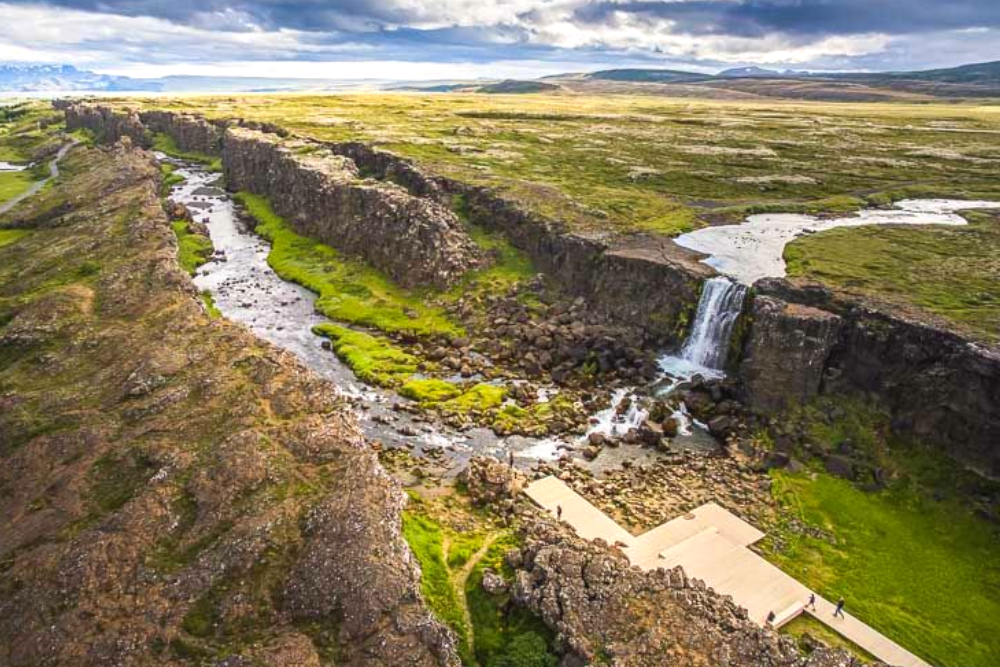 [Pingvellir] is a historic site and national park in Iceland, east of Reykjavík. It's known for the Alþing (Althing), the site of Iceland's parliament from the 10th to 18th centuries. On the site are the Þingvellir Church and the ruins of old stone shelters. The park sits in a rift valley caused by the separation of 2 tectonic plates, with rocky cliffs and fissures like the huge Almannagjá fault.