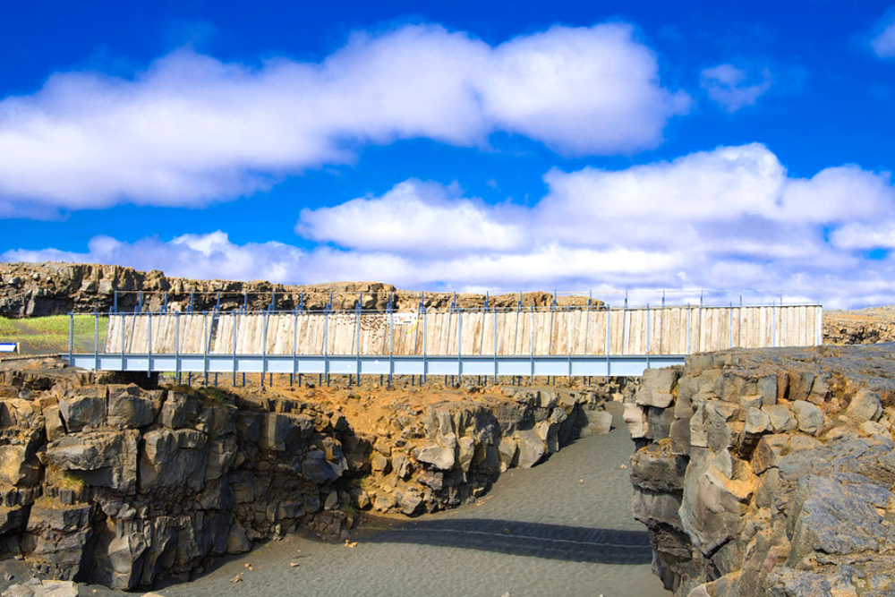 [Bridge Between Continents] is a small footbridge over a major fissure which provides clear evidence of the presence of a diverging plate margin. The bridge was built as a symbol for the connection between Europe and North America.