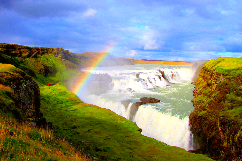 [Gullfoss] is two separate waterfalls; the upper one has a drop of 11 meters and the lower one 21 meters. The rock of the river bed was formed during an interglacial period. Water flows over Gullfoss at an average rate of 109 cubic meters per second.