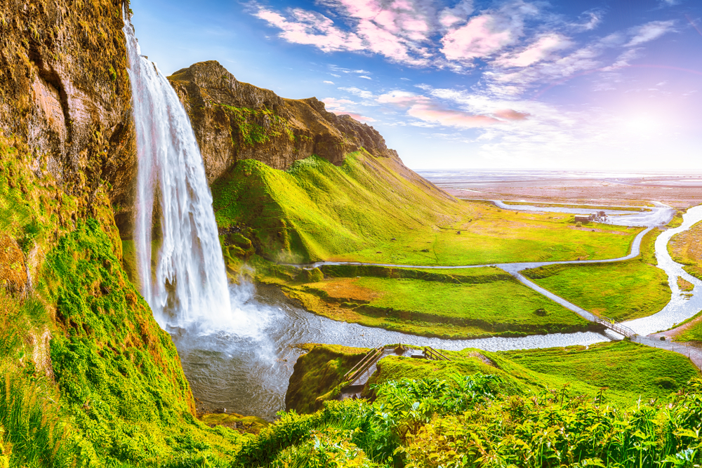 [Seljalandsfoss] is a beautiful waterfall along the southern coast. It cascades over steep cliffs, which makes it possible for you to walk behind the waterfall. You will get a spectacular view of the waterfall itself and the surrounding.