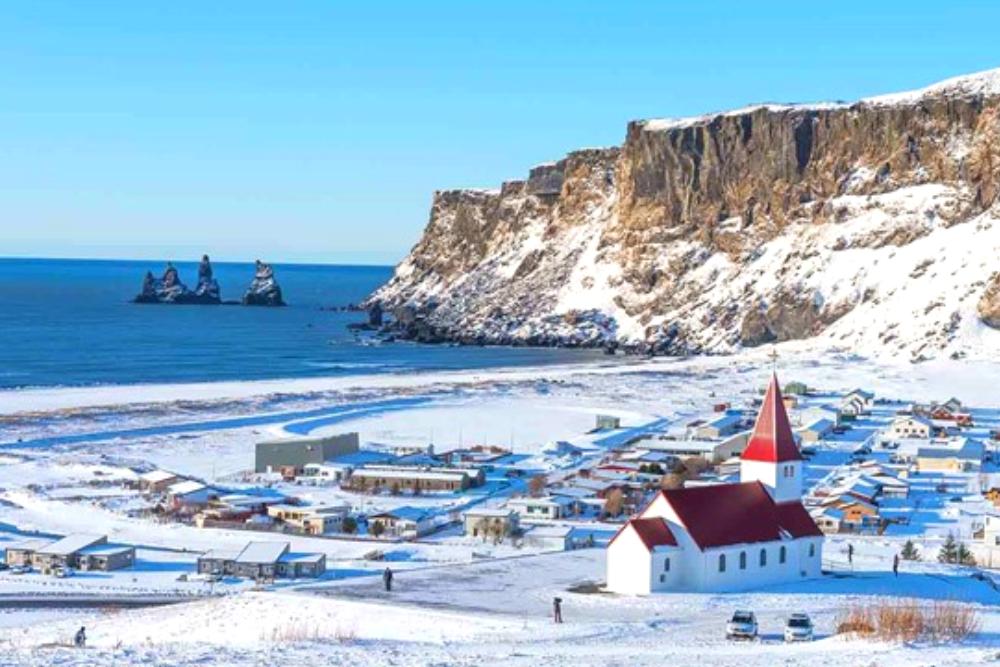 [Vik] is Iceland's most southerly village and one of the most popularly photographed areas in the country. The peaceful seafront village sits along a dramatic stretch of coastline, quaintly poised between glacier topped mountains, rugged sea cliffs and black sand beaches.