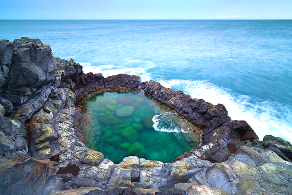 [Brimketill] is a small, naturally carved pool, by marine erosion, at the lava shore edge west of the town of Grindavik. Renowned for its differing beauty between the seasons and its folklore.