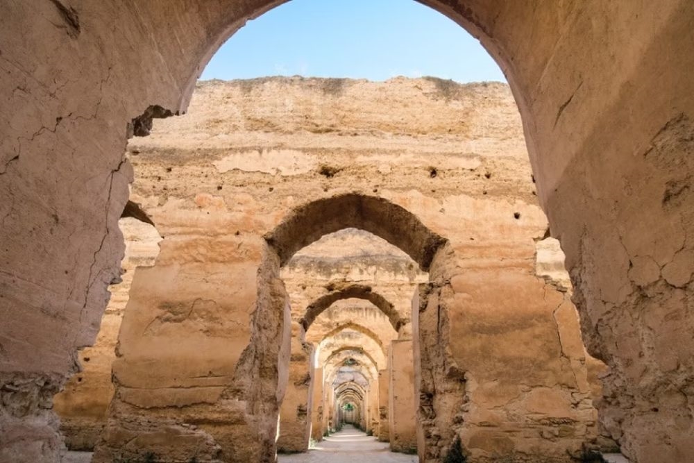 [Royal Stables] Sultan Moulay Ismail's marble palace was largely destroyed in an earthquake in 1755. One of the only parts of the palace complex still remaining are the incredible Royal Stables at Meknes. Despite their age and ruined condition, the Royal Stables are a stunning example of the world that Sultan Moulay Ismail created during his time in power.