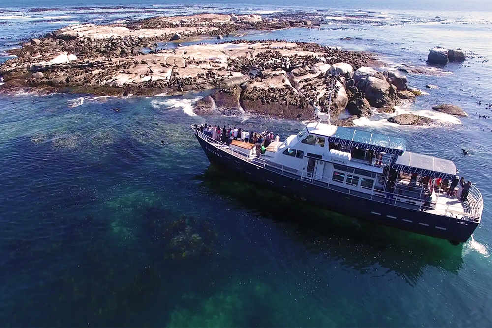 Circe Launches Seal Island Cruise has a duration of between 40 and 60 minutes. Calypso is the only glass-bottomed open motorboat in South Africa, designed for passenger comfort and safety, with ample outside deck seating, upper deck viewing, and comfortable inside cabin seating. During good visibility, passengers are able to get a first-hand view of the kelp forests and the abundant sea life at Duiker Island/Seal Island. The boat's powerful engines enable the crew to bring the vessel within meters of the island, for a really close-up view of the Cape fur seals in their natural environment.