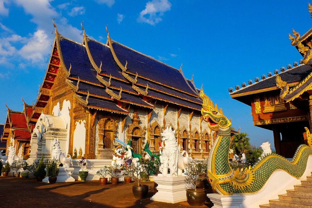 [Blue Temple] located on the outskirts of Mae Daeng, about 40 kilometers north of Chiang Mai. It is a century-old temple of grand proportions.