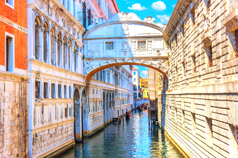 [Bridge of Sighs] is made of white limestone, has windows with stone bars, passes over the Rio di Palazzo, and connects the New Prison to the interrogation rooms in the Doge's Palace.