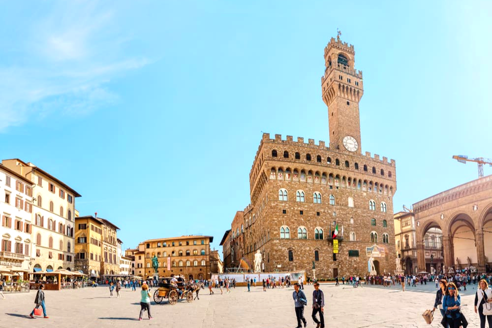 [Piazza Signoria] is a w-shaped square in front of the Palazzo Vecchio in Florence, Italy. It is the main point of the origin and history of the Florentine Republic and still maintains its reputation as the political focus of the city.
