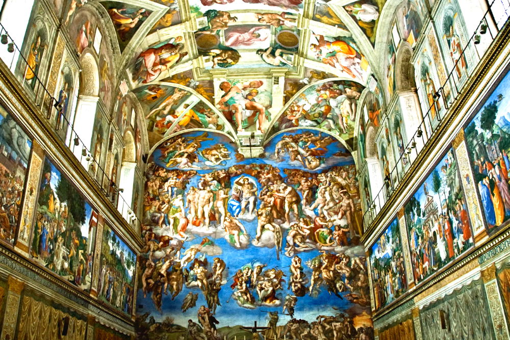 [Sistine Chapel] is a rectangular brick building with six arched windows on each of the two main (or side) wall and a barrel-vaulted ceiling. The chapel's exterior is drab and unadorned, but its interior walls and ceiling are decorated with frescoes by many Florentine Renaissance masters.