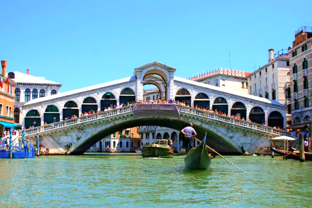 [Rialto Bridge] is the oldest of the four bridges spanning the Grand Canal in Venice, Italy. Connecting the districts of San Marco and San Polo, it has been rebuilt several times since its first construction as a pontoon bridge in 1173, and is now a significant tourist attraction in the city.
