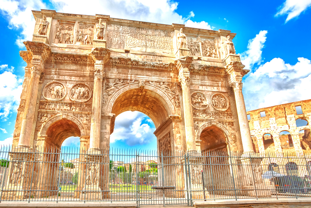 [Arch of Constantine] is a triumphal arch in Rome dedicated to the emperor Constantine the Great. The arch was commissioned by the Roman Senate to commemorate Constantine's victory over Maxentius at the Battle of Milvian Bridge in AD 312.