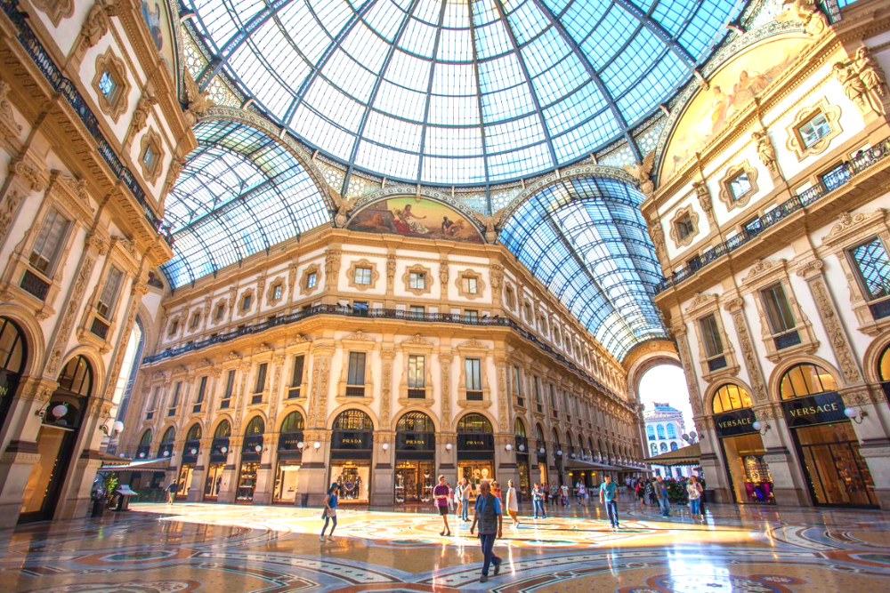 [Galleria Vittorio Emanuele II] the oldest active shopping mall and also one of Milan's most major landmarks. It presents a four-storey double arcade and can easily be found in the center of the city.