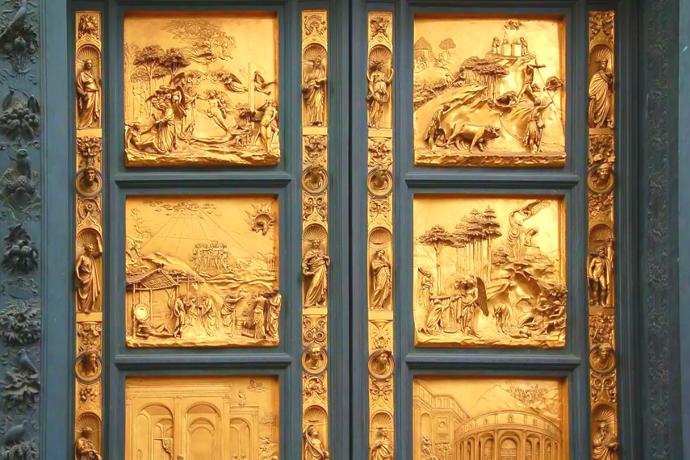 [Door of Paradise] consist of twenty-eight quatrefoil panels, with the twenty top panel depicting scenes from the life of St. John the Baptist. The eight lower panels depict the eight virtues of hope, faith, charity, humility, fortitude, temperance, justice, and prudence.