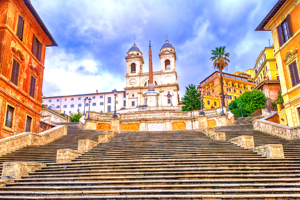 [Spanish Steps] are the steps that lead from Piazza di Spagna square to the French monastery church Trinita dei Monti. There are 135 steps and three different terraces, referring to the Holy Trinity.
