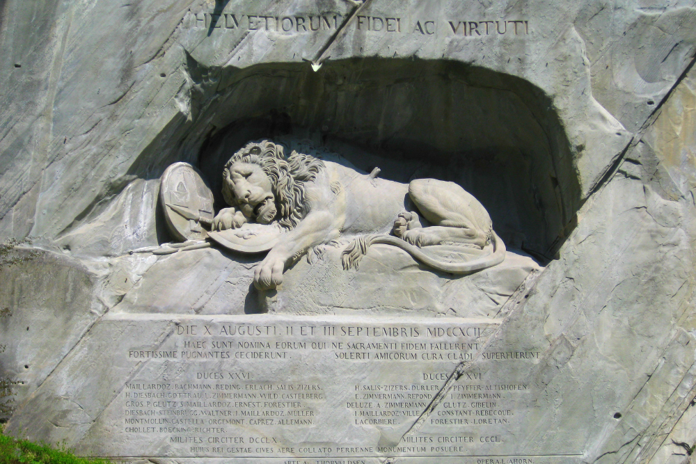 [The Lion Monument] or the Lion of Lucerne, is a rock relief in Lucerne, Switzerland, designed by Bertel Thorvaldsen and hewn in 1820–21 by Lukas Ahorn.