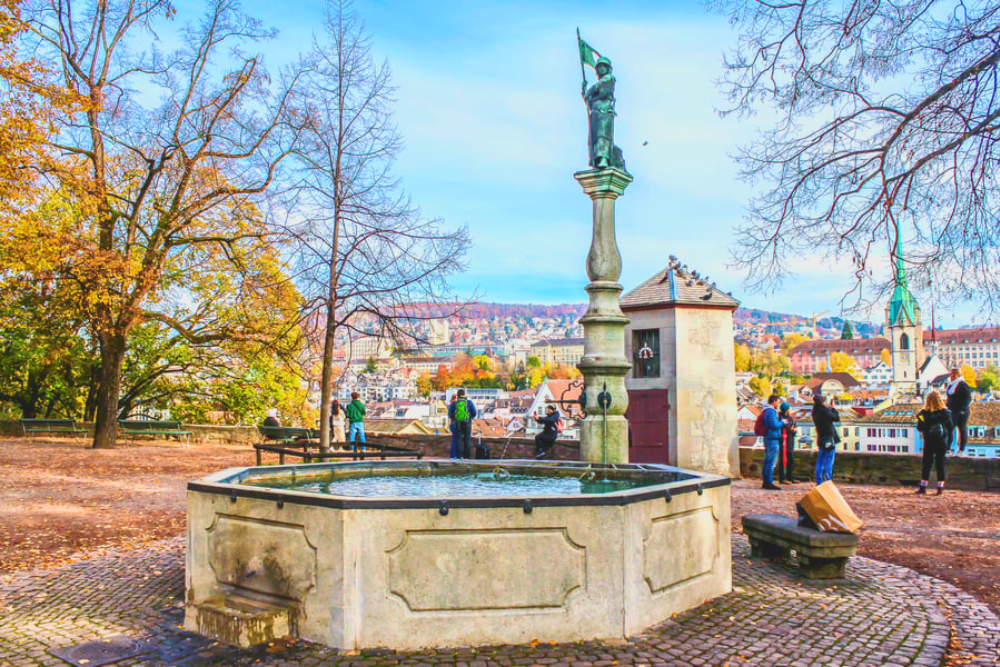 [Lindenhof Park] is a tree-covered park in the city of Zurich with wonderful views to the River Limmat, the Lake Zurich and to the Niederdorf.
