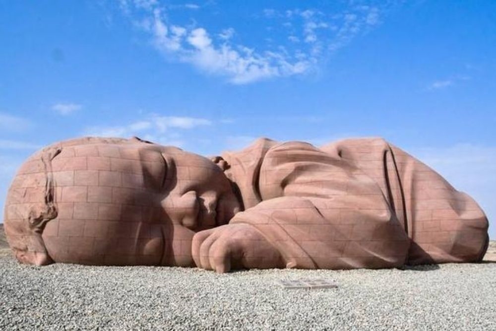 [Giant Sculpture in the Desert] This sculpture is built of rough red sandstone, with 15m length, 4.3m height, and 9m wide. It is a sculpture of a baby lying on the ground and sleep peacefully.